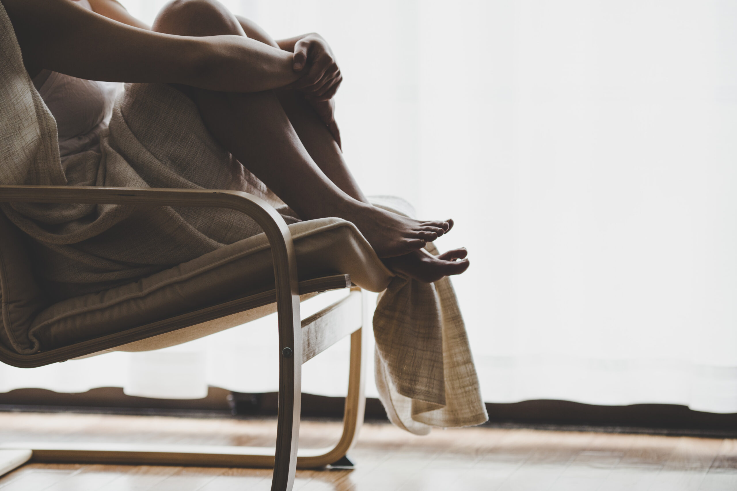 窓際で椅子に座っている寂しい女性